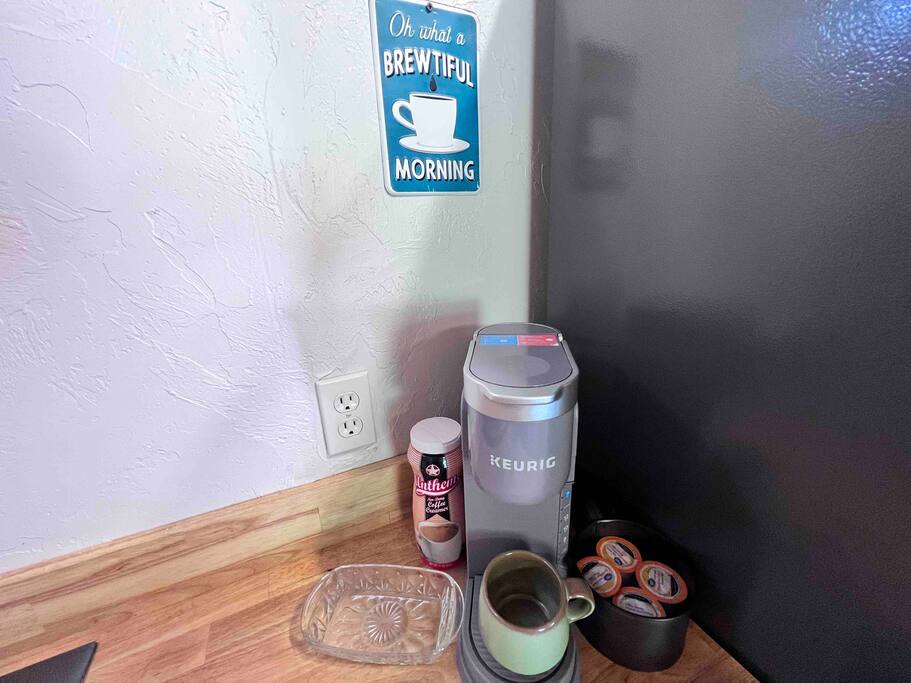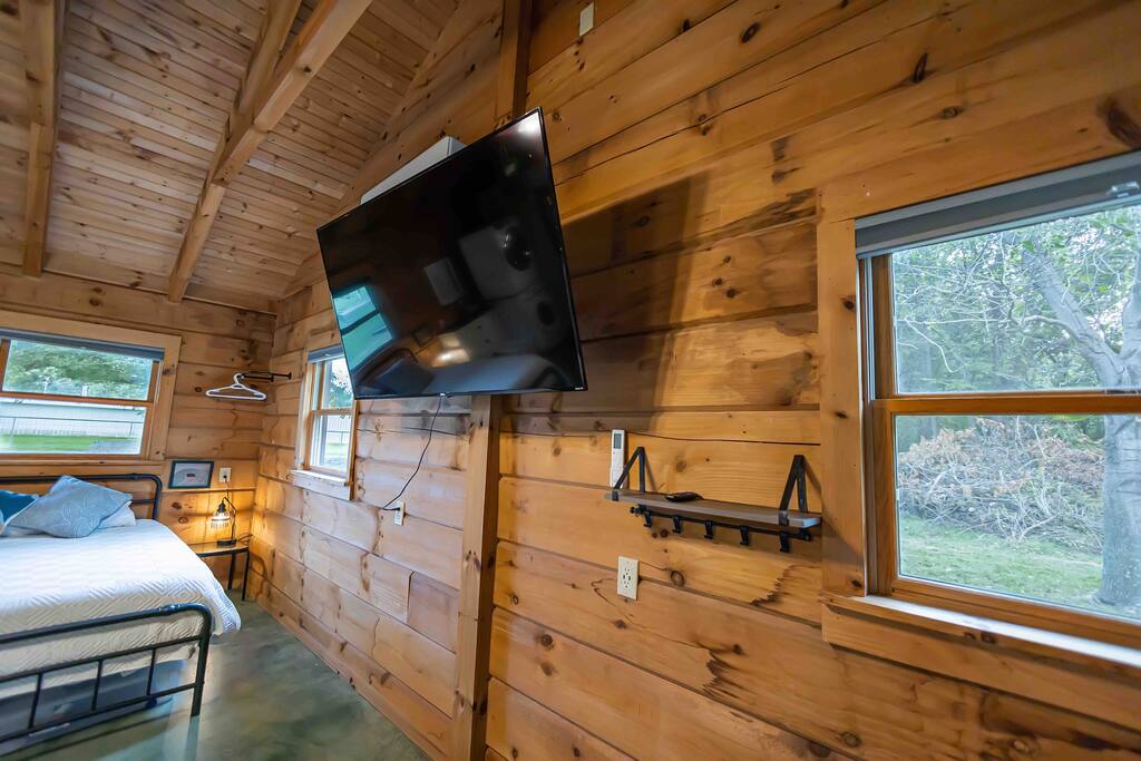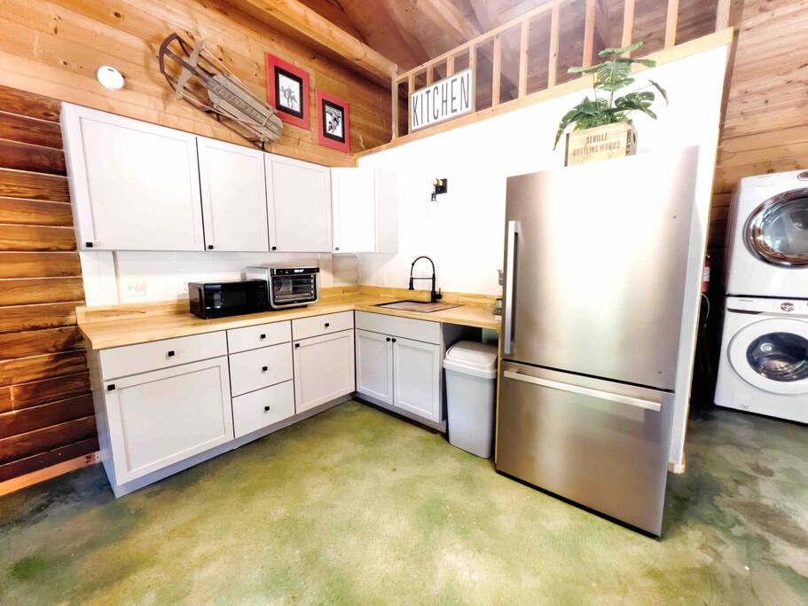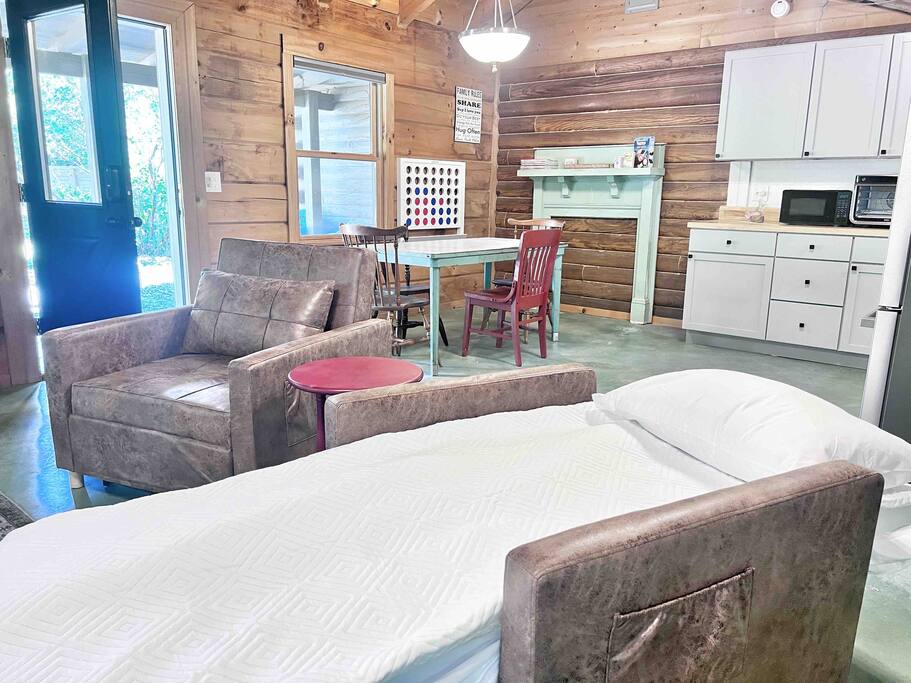 We have a tornado shelter. Welcome to our splendid and vibrant cabin, boasting a generous 500 square feet of sheer luxury. This beautifully adorned suite boasts a sumptuous king-sized bed, a hidden queen-sized pull out couch, and two magical single chairs that transform into cozy sleeping spots, making it a haven for couples or adventurous families. Need even more space? Traveling with a lively crew of friends? Explore our other listing, Bigfoot's Cabin, accommodating an extra 4 humans on the same enchanting acreage. Check it out here: https://abnb.me/RFcKuIkDTBb Now, let's dive into the suite itself: Its eclectic and snug decor dances harmoniously with its lofty vaulted ceilings, rustic log walls, and mighty wooden beams. Together, they craft a warm and captivating ambiance that'll wrap you in a comforting embrace. Flooded with natural light and plenty of room to lounge, this suite is your perfect sanctuary for vacations or remote digital nomad escapades. The bathroom is generously sized, equipped with all the pampering essentials you crave, featuring a spacious shower and plush towels. And when it's time to kick back and unwind indoors, surrender to the plush seating area and indulge in your beloved shows or movies on the magnificent 65" flat-screen TV. Welcome to your vibrant hideaway!